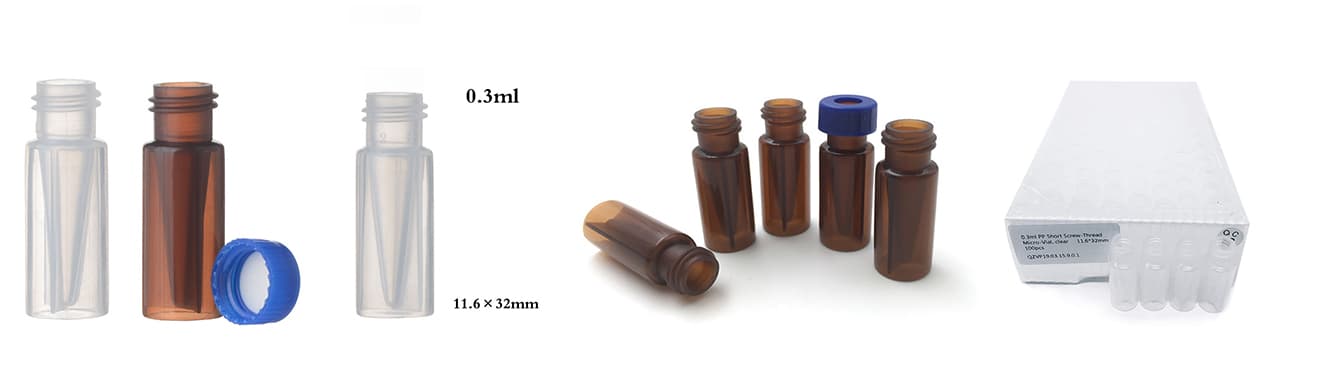 VP93 | 0.3毫升琥珀色聚丙烯短螺旋微型样品瓶,9毫米螺纹,11.6×32毫米,100个/包 |