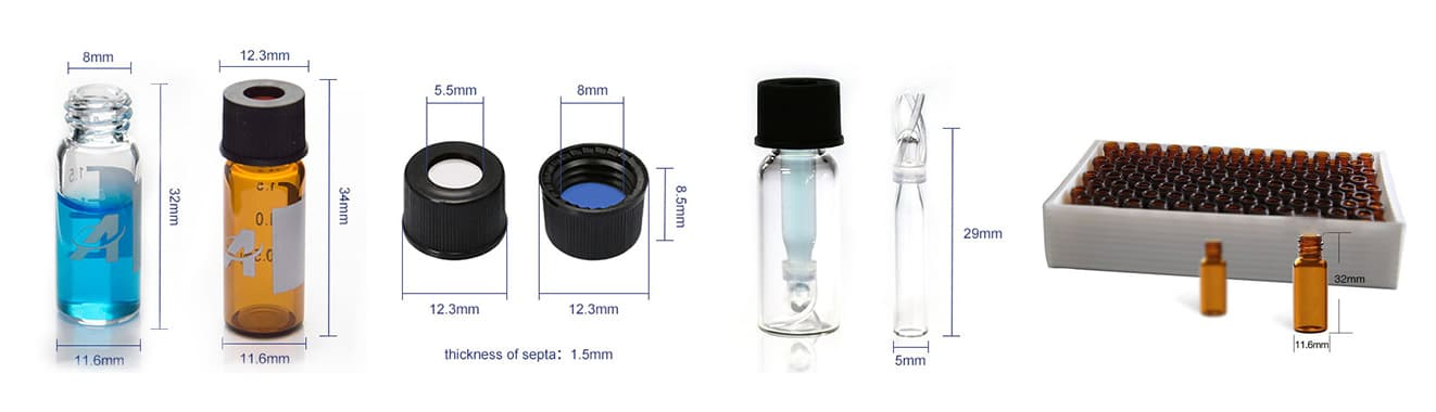 | 容量:1.5-2.0ml 尺寸:11.6x32mm 颜色:琥珀色和透明 颈部:螺旋颈 颈部直径:8mm 材料:溴硅酸盐玻璃/一级水解玻璃 隔垫:无缝、预缝、PTFE/硅胶 内 插件:150ul/250u |